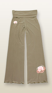 のびのび素材のパンツは、どんな脚の動きにも対応できるので安心感があります。また左脚裾と右腰に施したロータス刺繍がオシャレなアクセント!